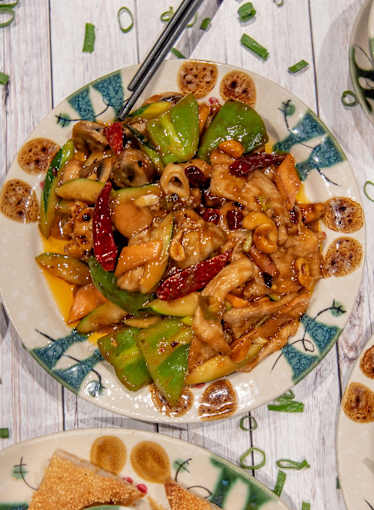 Tender chicken fillets stir-fried with crunchy cashews in a savory sauce, offering a delightful blend of textures and flavors.